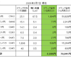 毎週水曜日は「FXスワップ生活への積立日」です。 積立配分・購入数量は、以下の通りです。 ※積立後のポジション掲載もあり 積立購入の明細 FXスワップ生活の積立 2026年3月4日(水) 積立金額:10,000円 ・トル […]