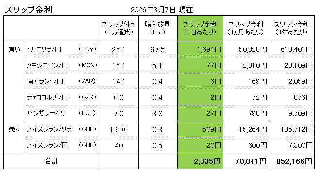 ※上記スワップ金利は、トレイダーズ証券の「みんなのFX」の【LIGHTペア】です。