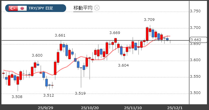 トルコリラ3.66円台キープ。