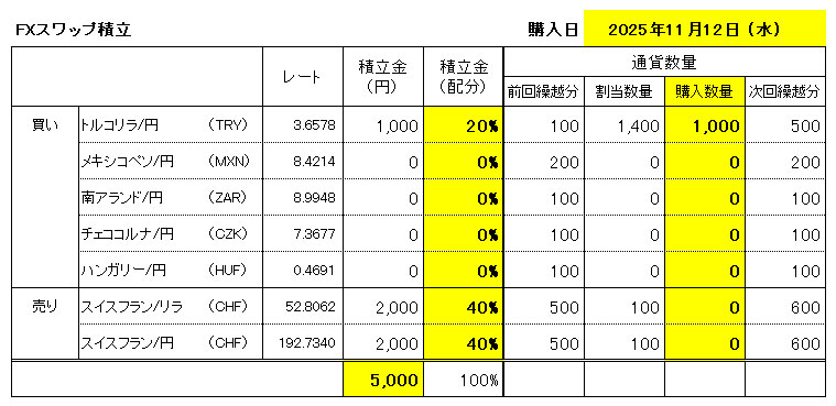 とりあえず「スイスフラン/トルコリラ」の繰り越し積立を始めています。