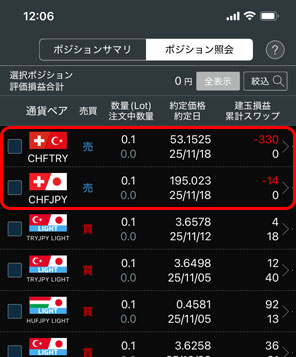 ・スイスフラン/トルコリラ 0.1ロット(売り)