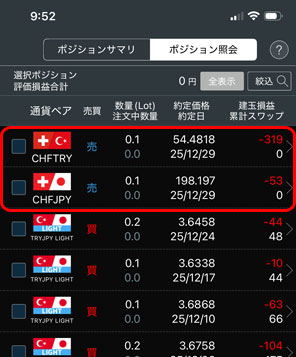 ・スイスフラン/トルコリラ 0.1ロット(売り)